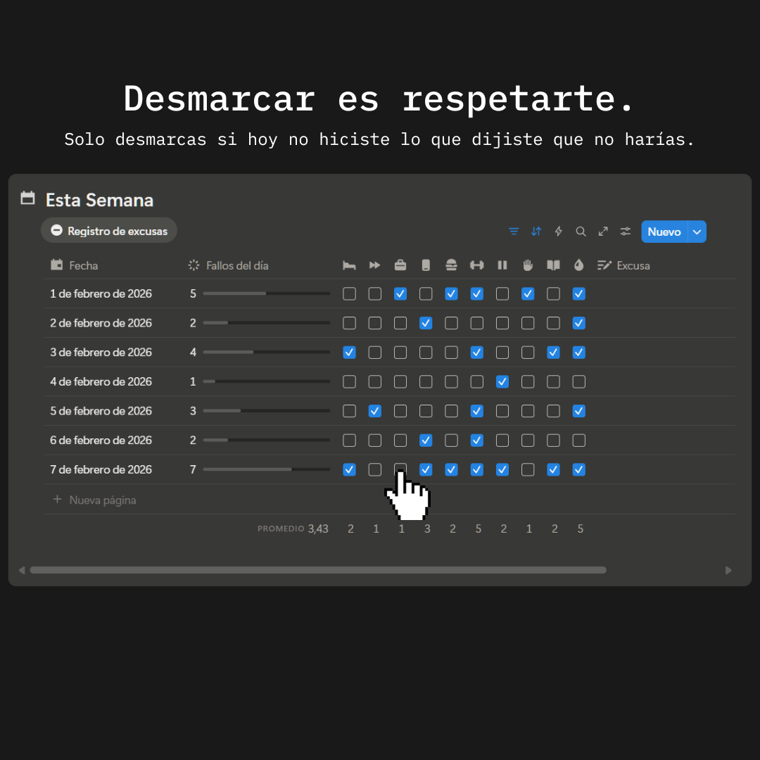 A diferencia de un tracker común, todo empieza marcado y solo desmarcas si no fallaste, sin medir progreso ni celebrar avances.